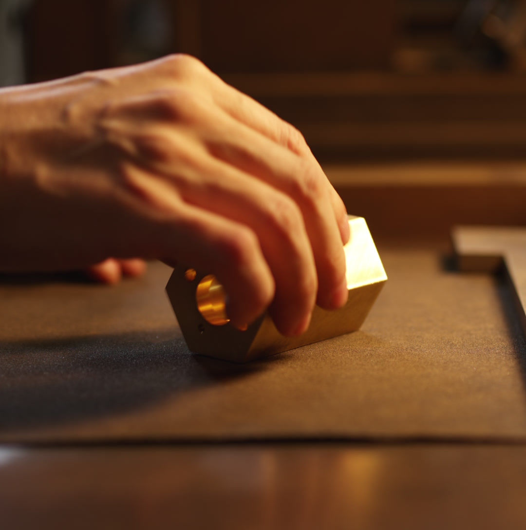 形としては六角柱の真鍮の塊と電球というシンプルさですが、仕上げの表情を出すためにいくつも工程を重ねています。真鍮の表面は元々の素材としてはツルツルしているのですが、手で磨いたり、石の中に入れて機械で回したりすることによって、光沢の取れた少しざらざらとした独特の表情を出しています。